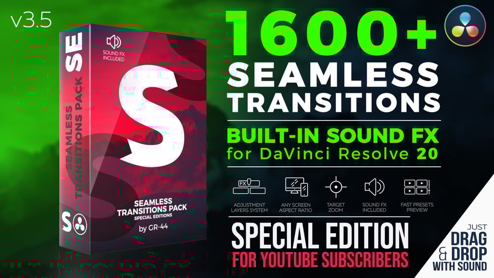 Seamless Transitions SE for DaVinci Resolve is created for subscribers of my YouTube channel, so a mandatory condition for using this package is your subscription to my YouTube channel - https://www.youtube.com/@gr-44motiondesigner95. Please do this before using this version of the package.